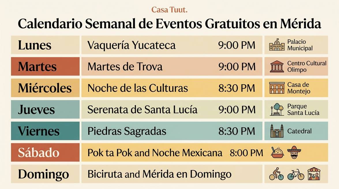 Meta Description: Descubre los eventos semanales gratuitos en Mérida: Vaquería, Serenata de Santa Lucía, Noche Mexicana, video mapping y más. Horarios, lugares y consejos locales.